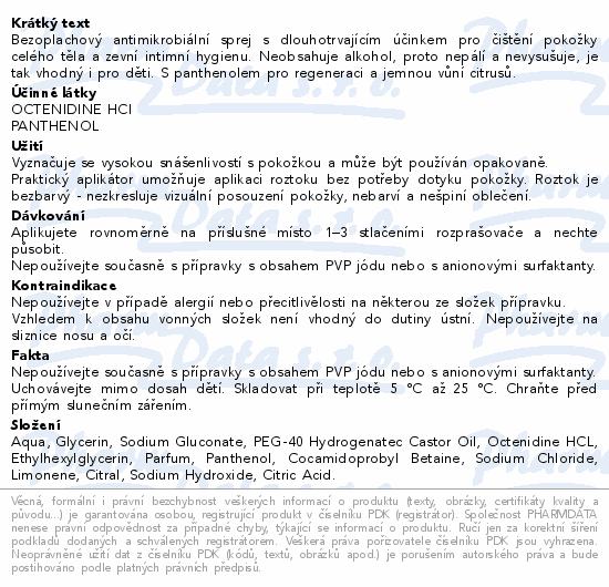 Bezoplachový antimikrobiální sprej s dlouhotrvajícím účinkem pro čištění pokožky celého těla a zevní intimní hygienu. Neobsahuje alkohol, proto nepálí a nevysušuje, je tak vhodný i pro děti. S panthenolem pro regeneraci a jemnou vůní citrusů.