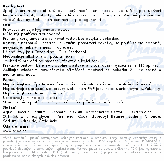 Sprej s antimikrobiální složkou, který nepálí ani nebarví. Je určen pro udržení hygienické čistoty pokožky celého těla a zevní intimní hygienu. Vhodný pro všechny věkové skupiny. S obsahem panthenolu pro regeneraci.