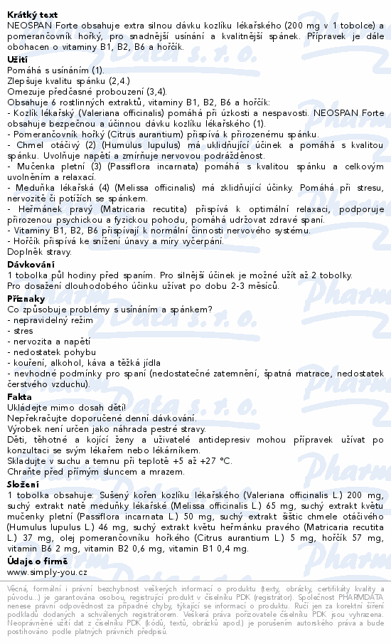 NEOSPAN Forte obsahuje extra silnou dávku kozlíku lékařského (200 mg v 1 tobolce) a pomerančovník hořký, pro snadnější usínání a kvalitnější spánek. Přípravek je dále obohacen o vitaminy B1, B2, B6 a hořčík.