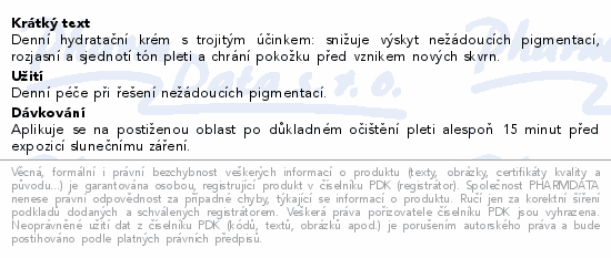 Denní hydratační krém s trojitým účinkem: snižuje výskyt nežádoucích pigmentací, rozjasní a sjednotí tón pleti a chrání pokožku před vznikem nových skvrn.