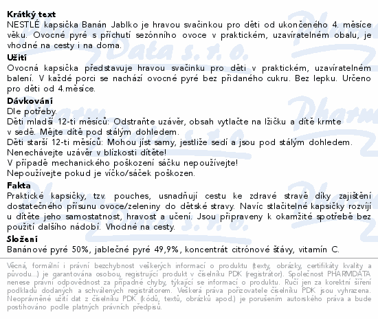 NESTLÉ kapsička Banán Jablko je hravou svačinkou pro děti od ukončeného 4. měsíce věku. Ovocné pyré s příchutí sezónního ovoce v praktickém, uzavíratelném obalu, je vhodné na cesty i na doma.
