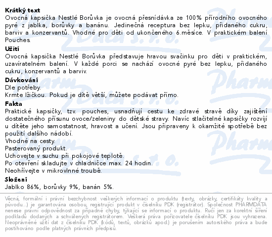 Ovocná kapsička Nestlé Borůvka je ovocná přesnídávka ze 100% přírodního ovocného pyré z jablka, borůvky a banánu. Jedinečná receptura bez lepku, přidaného cukru, barviv a konzervantů. Vhodné pro děti od ukončeného 6.měsíce. V praktickém balení Pouches.