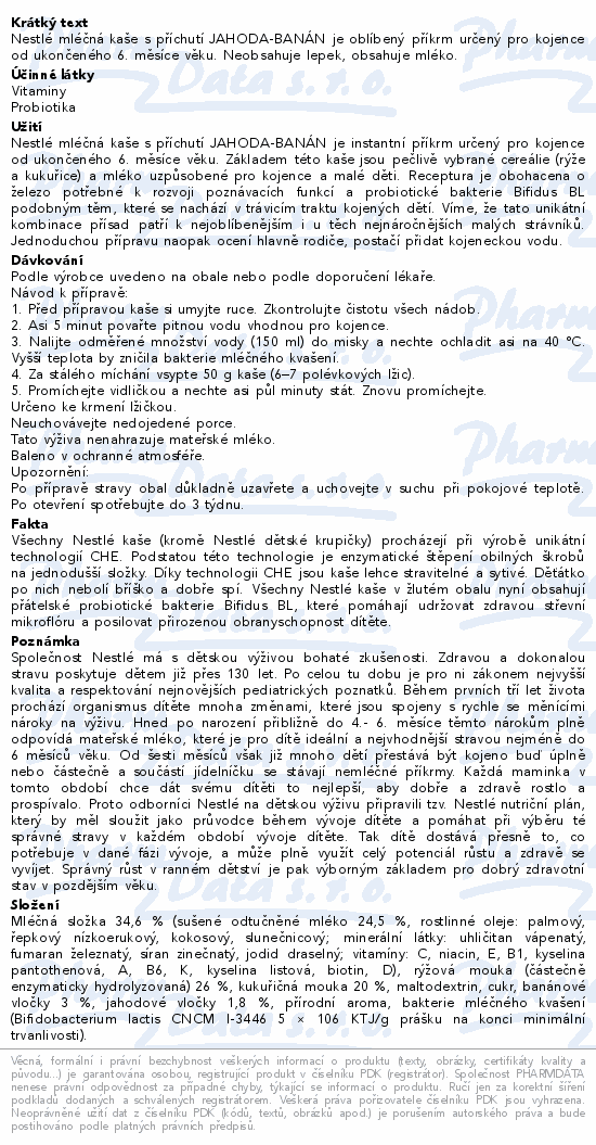 Nestlé mléčná kaše s příchutí JAHODA-BANÁN je oblíbený příkrm určený pro kojence od ukončeného 6. měsíce věku. Neobsahuje lepek, obsahuje mléko.