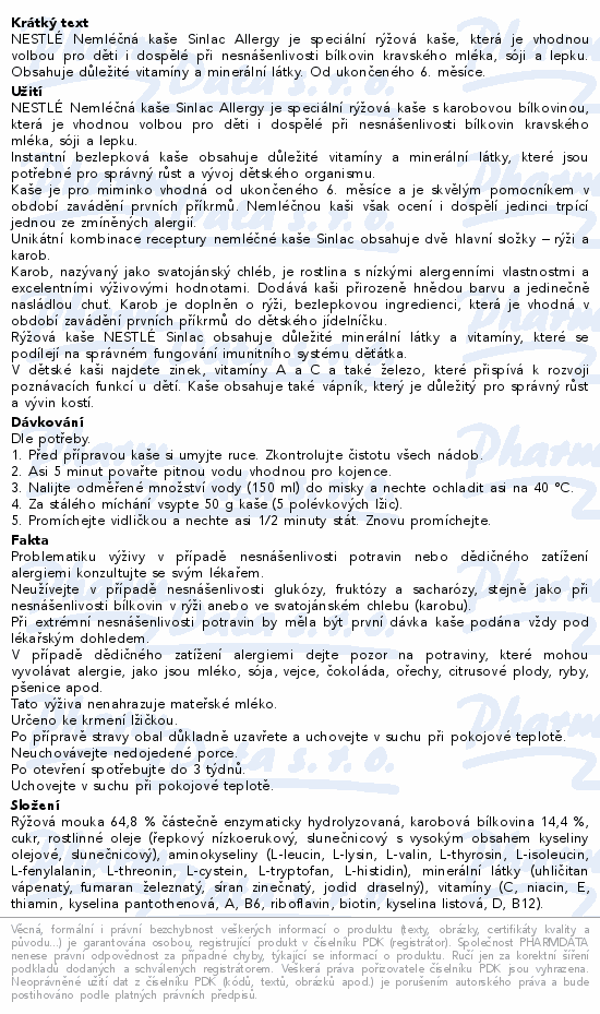 NESTLÉ Nemléčná kaše Sinlac Allergy je speciální rýžová kaše, která je vhodnou volbou pro děti i dospělé při nesnášenlivosti bílkovin kravského mléka, sóji a lepku. Obsahuje důležité vitamíny a minerální látky. Od ukončeného 6. měsíce.