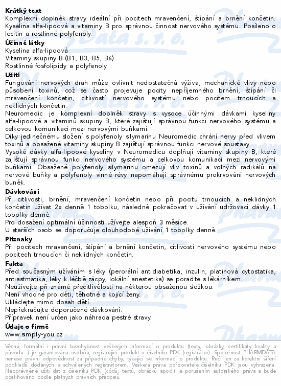 Komplexní doplněk stravy ideální při pocitech mravenčení, štípání a brnění končetin. Kyselina alfa-lipoová a vitaminy B pro správnou činnost nervového systému. Posíleno o lecitin a rostlinné polyfenoly.