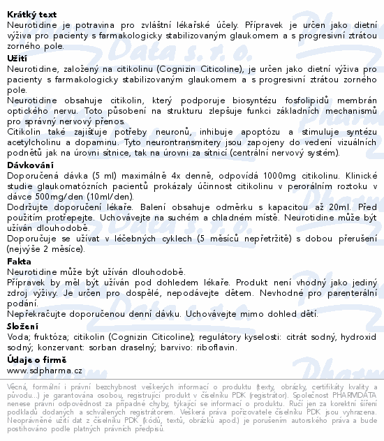Neurotidine je potravina pro zvláštní lékařské účely. Přípravek je určen jako dietní výživa pro pacienty s farmakologicky stabilizovaným glaukomem a s progresivní ztrátou zorného pole.