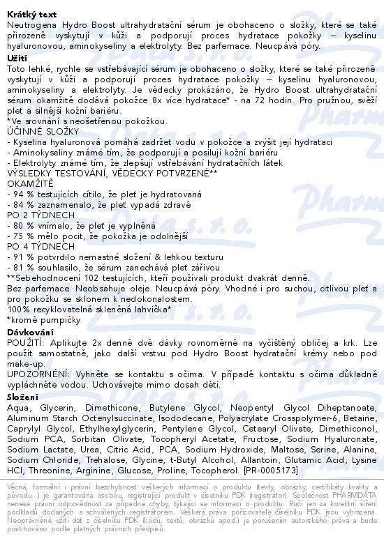 Neutrogena Hydro Boost ultrahydratační sérum je obohaceno o složky, které se také přirozeně vyskytují v kůži a podporují proces hydratace pokožky – kyselinu hyaluronovou, aminokyseliny a elektrolyty. Bez parfemace. Neucpává póry.