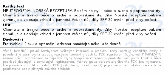 NEUTROGENA NORSKÁ RECEPTURA Balzám na rty - péče o suché a popraskané rty. Okamžitá a trvající péče o suché a popraskané rty. Díky Norské receptuře balzám zjemňuje a zlepšuje vzhled a jemnost Vašich rtů, díky SPF 20 chrání před vlivy počasí.