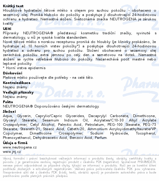 Hloubkově hydratační tělové mléko s olejem pro suchou pokožku - obohaceno o sezamový olej. Proniká hluboko do pokožky a poskytuje jí dlouhotrvající 24-hodinovou ochranu a hydrataci. Nemastné složení. Světoznámá značka NEUTROGENA je zárukou kvality.