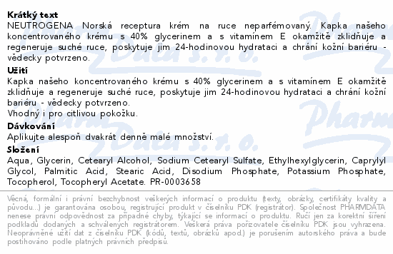 NEUTROGENA Norská receptura krém na ruce neparfémovaný. Kapka našeho koncentrovaného krému s 40% glycerinem a s vitamínem E okamžitě zklidňuje a regeneruje suché ruce, poskytuje jim 24-hodinovou hydrataci a chrání kožní bariéru - vědecky potvrzeno.