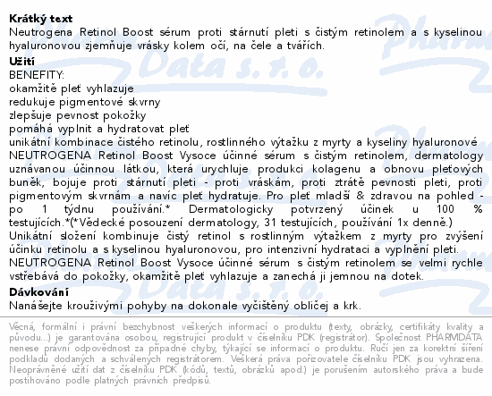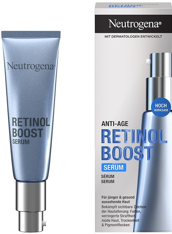 Neutrogena Retinol Boost sérum proti stárnutí pleti s čistým retinolem a s kyselinou hyaluronovou zjemňuje vrásky kolem očí, na čele a tvářích.