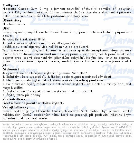 Nicorette Classic Gum 2 mg s jemnou neutrální příchutí ti pomůže při odvykání kouření. Díky rychlému nástupu účinku zmírňuje chuť na cigaretu a abstinenční příznaky. Balení obsahuje 105 kusů. Čtěte pozorně příbalový leták.