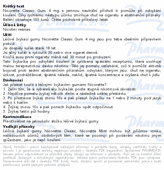 Nicorette Classic Gum 4 mg s jemnou neutrální příchutí ti pomůže při odvykání kouření. Díky rychlému nástupu účinku zmírňuje chuť na cigaretu a abstinenční příznaky. Balení obsahuje 105 kusů. Čtěte pozorně příbalový leták.
