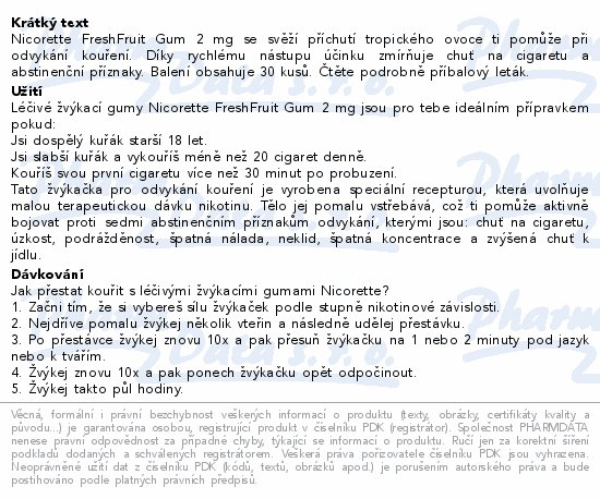 Nicorette FreshFruit Gum 2 mg se svěží příchutí tropického ovoce ti pomůže při odvykání kouření. Díky rychlému nástupu účinku zmírňuje chuť na cigaretu a abstinenční příznaky. Balení obsahuje 30 kusů. Čtěte pozorně příbalový leták.