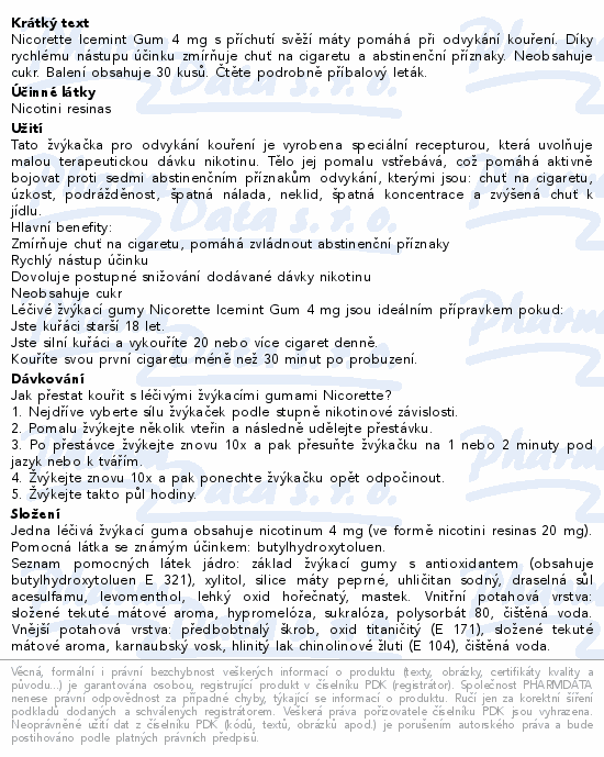 Nicorette Icemint Gum 4 mg s příchutí svěží máty pomáhá při odvykání kouření. Díky rychlému nástupu účinku zmírňuje chuť na cigaretu a abstinenční příznaky. Neobsahuje cukr. Balení obsahuje 30 kusů. Čtěte pozorně příbalový leták.