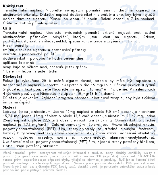 NICORETTE INVISIPATCH 15MG/16H transdermální náplasti 7 vám pomůže zmírnit chuť na cigaretu a abstinenční příznaky. Diskrétní poloprůhlední náplast dodává nikotin v průběhu dne, kdy bývá nejtěžší odolat chuti na cigaretu. Působí po dobu 16 hodin, není ji tedy nutné aplikovat během noci. Balení obsahuje 7 ks náplastí - pro celý týden bez cigaret.