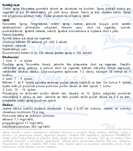 Orální sprej Nicorette pomáhá zbavit se závislosti na kouření. Sprej potlačí touhu po cigaretě již po 30 sekundách, při užití dvou dávek. Navíc je bez obsahu cukru. Sprej má příjemnou příchuť máty. Čtěte pozorně příbalový leták.