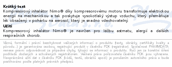Kompresorový inhalátor Nimo® díky kompresorovému motoru transformuje elektrickou energii na mechanickou a tak poskytuje vysokotlaký výstup vzduchu, který přeměňuje lék obsažený v pohárku na aerosol, který je snadno vdechovatelný.