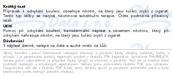 | Farmako-terapeutická skupina, účinné látky: | NERVOVÝ SYSTÉM -> JINÁ LÉČIVA NERVOVÉHO SYSTÉMU -> LÉČIVA K TERAPII ZÁVISLOSTÍ -> LÉČIVA K TERAPII ZÁVISLOSTI NA NIKOTINU -> NIKOTIN |