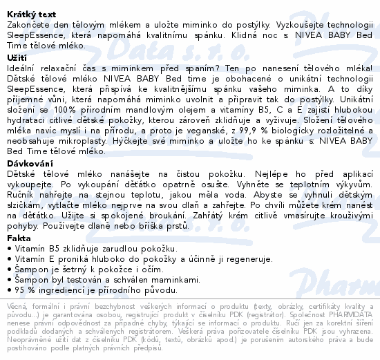 Zakončete den tělovým mlékem a uložte miminko do postýlky. Vyzkoušejte technologii SleepEssence, která napomáhá kvalitnímu spánku. Klidná noc s: NIVEA BABY Bed Time tělové mléko.