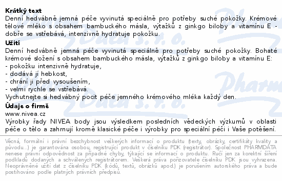 Denní hedvábně jemná péče vyvinutá speciálně pro potřeby suché pokožky. Krémové tělové mléko s obsahem bambuckého másla, výtažků z ginkgo biloby a vitamínu E - dobře se vstřebává, intenzivně hydratuje pokožku.