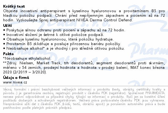Objevte inovativní antiperspirant s kyselinou hyaluronovou a provitamínem B5 pro hladkou pokožku podpaží. Chrání před nepříjemným zápachem a pocením až na 72 hodin. Vyzkoušejte Sprej antiperspirant NIVEA Derma Control Defend.