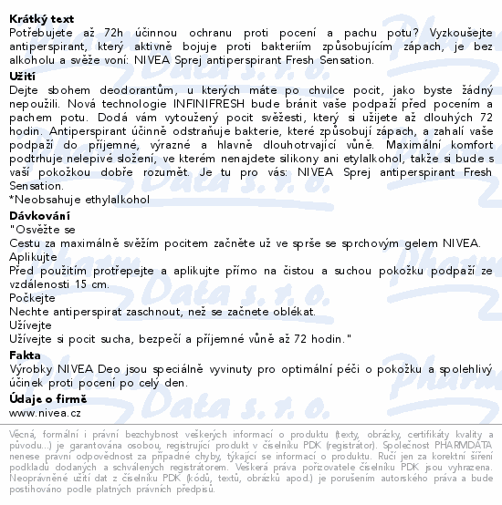 Potřebujete až 72h účinnou ochranu proti pocení a pachu potu? Vyzkoušejte antiperspirant, který aktivně bojuje proti bakteriím způsobujícím zápach, je bez alkoholu a svěže voní: NIVEA Sprej antiperspirant Fresh Sensation.