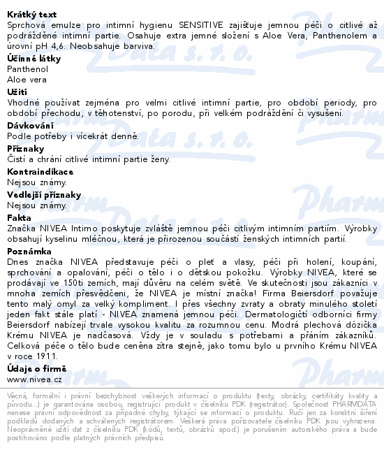 Sprchová emulze pro intimní hygienu SENSITIVE zajišťuje jemnou péči o citlivé až podrážděné intimní partie. Osahuje extra jemné složení s Aloe Vera, Panthenolem a úrovní pH 4,6. Neobsahuje barviva.