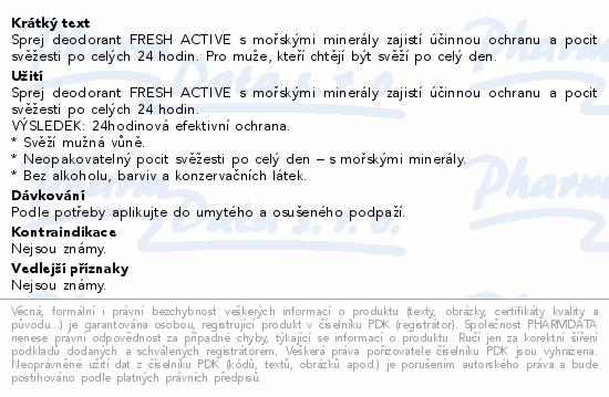 Sprej deodorant FRESH ACTIVE s mořskými minerály zajistí účinnou ochranu a pocit svěžesti po celých 24 hodin. Pro muže, kteří chtějí být svěží po celý den.