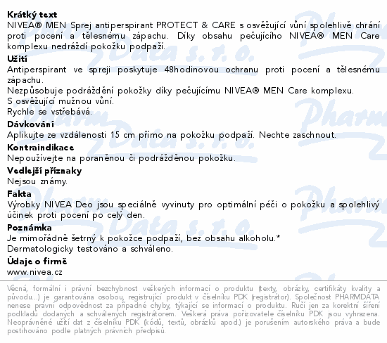 NIVEA® MEN Sprej antiperspirant PROTECT & CARE s osvěžující vůní spolehlivě chrání proti pocení a tělesnému zápachu. Díky obsahu pečujícího NIVEA® MEN Care komplexu nedráždí pokožku podpaží.