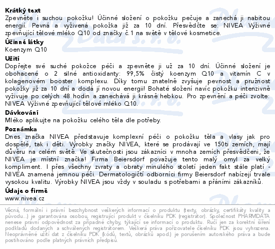 Zpevněte i suchou pokožku! Účinné složení o pokožku pečuje a zanechá ji nabitou energií. Pevná a vyživená pokožka již za 10 dní. Přesvědčte se: NIVEA Výživné zpevňující tělové mléko Q10 od značky č.1 na světě v tělové kosmetice.