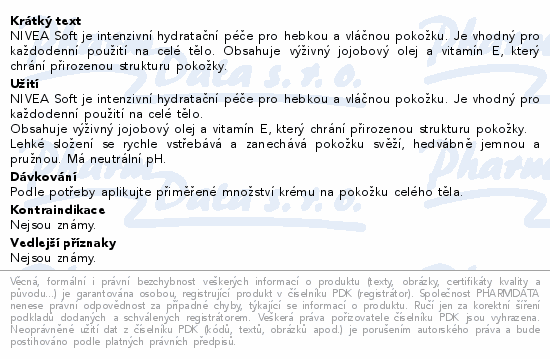 NIVEA Soft je intenzivní hydratační péče pro hebkou a vláčnou pokožku. Je vhodný pro každodenní použití na celé tělo. Obsahuje výživný jojobový olej a vitamín E, který chrání přirozenou strukturu pokožky.