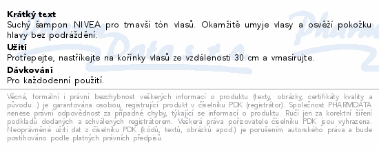 Suchý šampon NIVEA pro tmavší tón vlasů. Okamžitě umyje vlasy a osvěží pokožku hlavy bez podráždění.