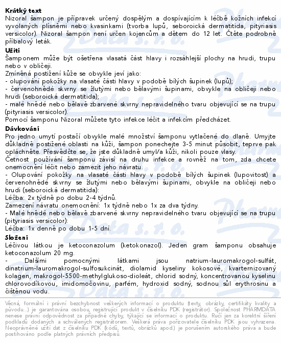 Nizoral šampon je přípravek určený dospělým a dospívajícím k léčbě kožních infekcí vyvolaných plísněmi nebo kvasinkami (tvorba lupů, seboroická dermatitida, pityriasis versicolor). Nizoral šampon není určen kojencům a dětem do 12 let. Čtěte pozorně příbalový leták.