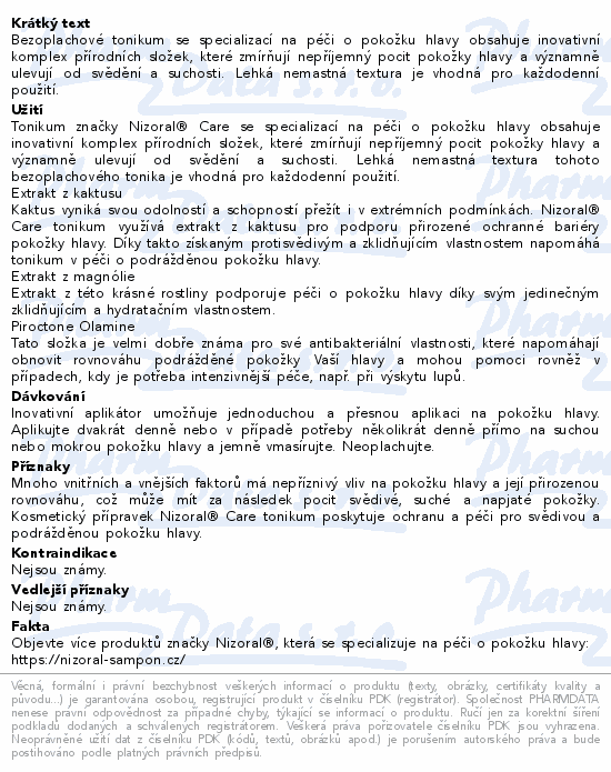 Ochrana & péče pro svědivou a podrážděnou pokožku hlavy s přírodními extrakty z magnólie a kaktusu. Nizoral® Care tonikum se specializací na péči o pokožku hlavy obsahuje inovativní komplex přírodních složek získaných z kaktusu a magnólie, které zmírňují nepříjemný pocit pokožky hlavy a významně ulevují od svědění a suchosti. Lehká nemastná textura tohoto bezoplachového tonika je vhodná pro každodenní použití.