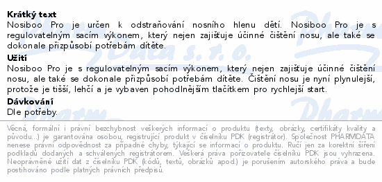 Nosiboo Pro je určen k odstraňování nosního hlenu dětí. Nosiboo Pro je s regulovatelným sacím výkonem, který nejen zajišťuje účinné čištění nosu, ale také se dokonale přizpůsobí potřebám dítěte.