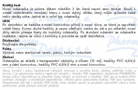 Nosní odsávačka je určena dětem mladším 3 let, které neumí sami smrkat. Slouží k odsátí nadměrného množství hlenu z nosní dutiny dítěte, který může způsobit kašel nebo záněty ucha. Jedná se o ruční typ odsávačky.