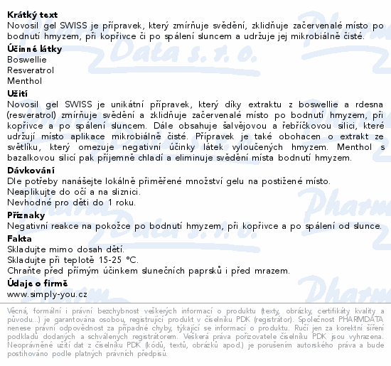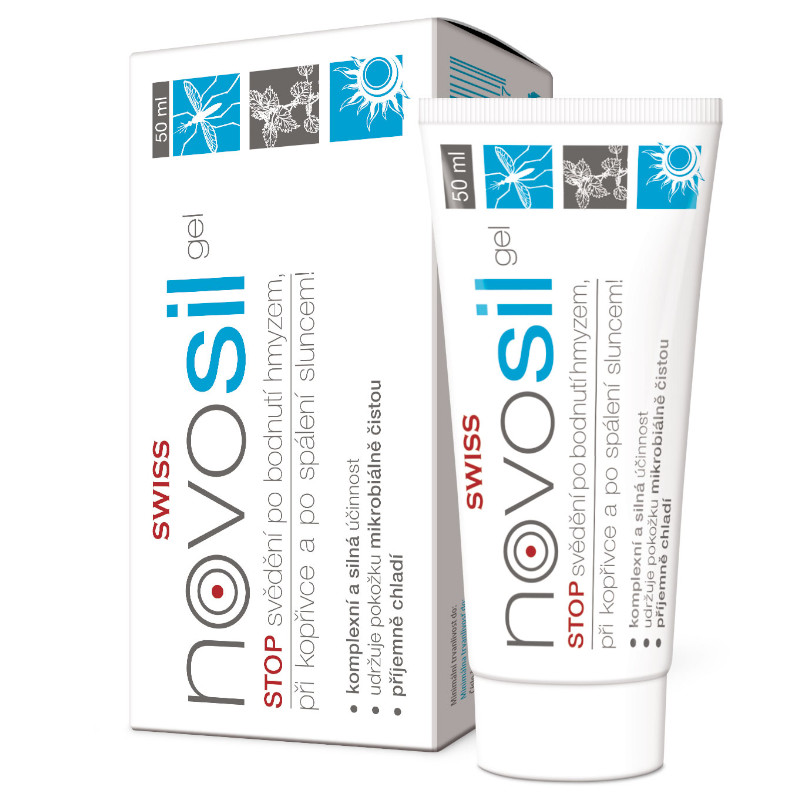 Novosil gel SWISS je přípravek, který zmírňuje svědění, zklidňuje začervenalé místo po bodnutí hmyzem, při kopřivce či po spálení sluncem a udržuje jej mikrobiálně čisté.