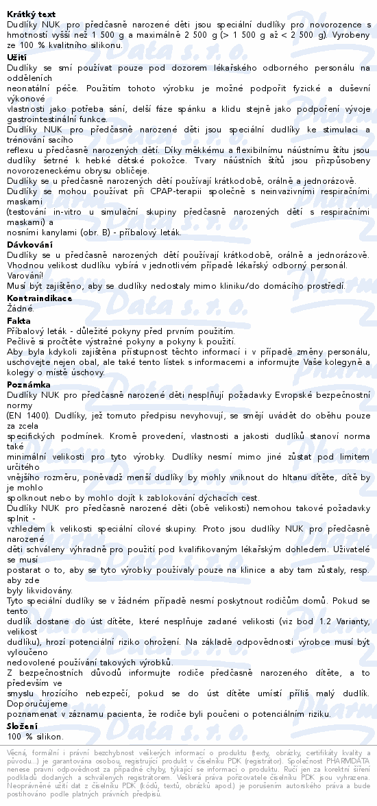 Dudlíky NUK pro předčasně narozené děti jsou speciální dudlíky pro novorozence s hmotností vyšší než 1 500 g a maximálně 2 500 g (> 1 500 g až < 2 500 g). Vyrobeny ze 100 % kvalitního silikonu.
