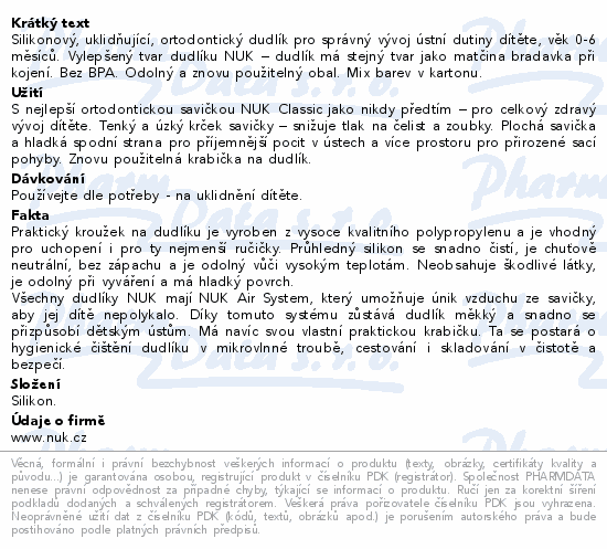 Silikonový, uklidňující, ortodontický dudlík pro správný vývoj ústní dutiny dítěte, věk 0-6 měsíců. Vylepšený tvar dudlíku NUK – dudlík má stejný tvar jako matčina bradavka při kojení. Bez BPA. Odolný a znovu použitelný obal. Mix barev v kartonu.