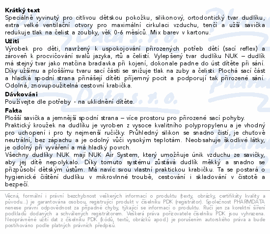 Speciálně vyvinutý pro citlivou dětskou pokožku, silikonový, ortodontický tvar dudlíku, extra velké ventilační otvory pro maximální cirkulaci vzduchu, tenčí a užší savička redukuje tlak na čelist a zoubky, věk 0-6 měsíců. Mix barev v kartonu.