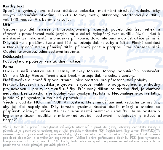 Speciálně vyvinutý pro citlivou dětskou pokožku, maximální cirkulace vzduchu díky velkým ventilačním otvorům, DISNEY Mickey motiv, silikonový, ortodontický dudlík , věk 6-18 měsíců. Mix barev v kartonu.