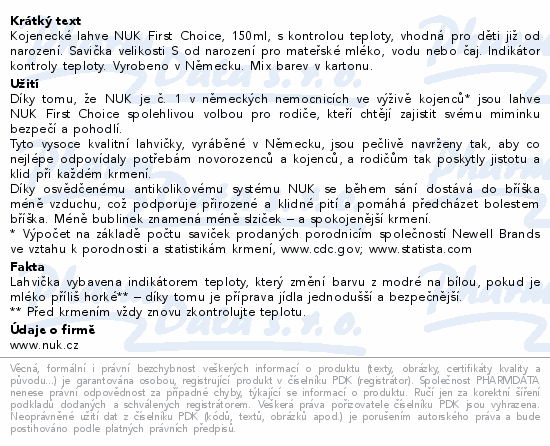 Kojenecké lahve NUK First Choice, 150ml, s kontrolou teploty, vhodná pro děti již od narození. Savička velikosti S od narození pro mateřské mléko, vodu nebo čaj. Indikátor kontroly teploty. Vyrobeno v Německu. Mix barev v kartonu.