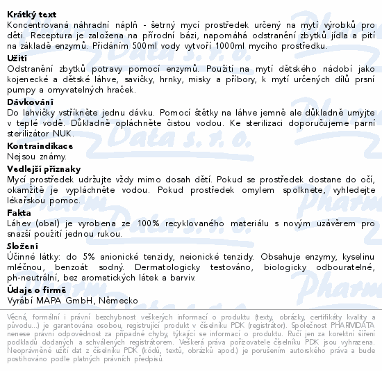 Koncentrovaná náhradní náplň - šetrný mycí prostředek určený na mytí výrobků pro děti. Receptura je založena na přírodní bázi, napomáhá odstranění zbytků jídla a pití na základě enzymů. Přidáním 500ml vody vytvoří 1000ml mycího prostředku.