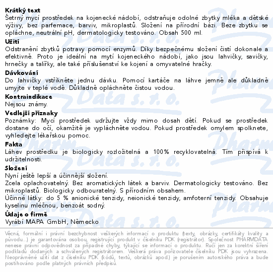 Šetrný mycí prostředek na kojenecké nádobí, odstraňuje odolné zbytky mléka a dětské výživy, bez parfemace, barviv, mikroplastů. Složení na přírodní bázi. Beze zbytku se opláchne, neutrální pH, dermatologicky testováno. Obsah 500 ml.