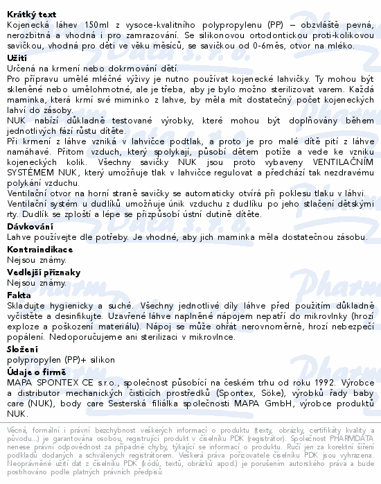 Kojenecká láhev 150ml z vysoce-kvalitního polypropylenu (PP) – obzvláště pevná, nerozbitná a vhodná i pro zamrazování. Se silikonovou ortodontickou proti-kolikovou savičkou, vhodná pro děti ve věku 0 měsíců, se savičkou od 0-6měs, otvor na mléko.