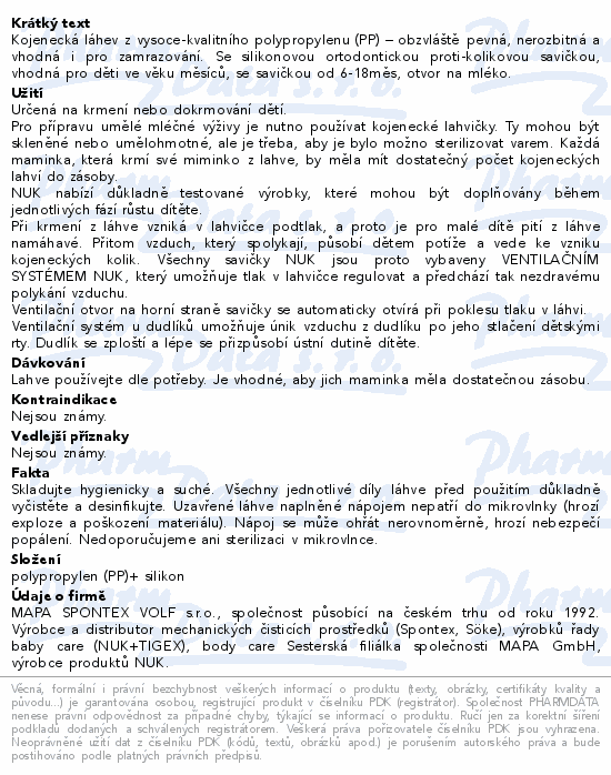 Kojenecká láhev z vysoce-kvalitního polypropylenu (PP) – obzvláště pevná, nerozbitná a vhodná i pro zamrazování. Se silikonovou ortodontickou proti-kolikovou savičkou, vhodná pro děti ve věku 0 měsíců, se savičkou od 6-18měs, otvor na mléko.