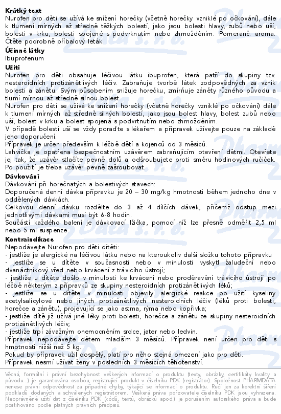 Nurofen pro děti se užívá ke snížení horečky (včetně horečky vzniklé po očkování), dále k tlumení mírných až středně těžkých bolestí, jako jsou bolesti hlavy, zubů nebo uší, bolesti v krku, bolesti spojené s podvrknutím nebo zhmožděním. Pomeranč. aroma. Čtěte pozorně příbalový leták.