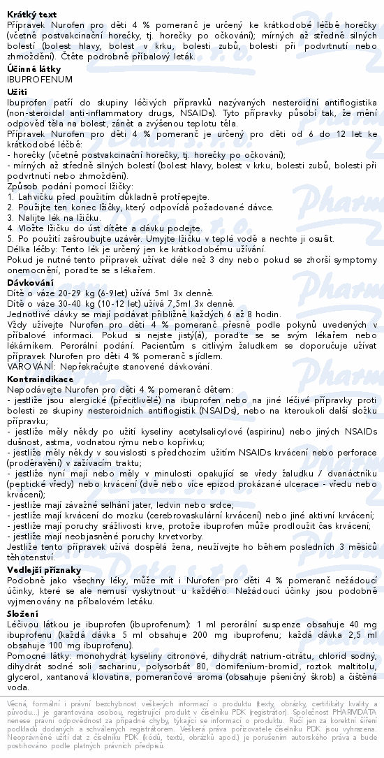 Přípravek Nurofen pro děti 4 % pomeranč je určený ke krátkodobé léčbě horečky (včetně postvakcinační horečky, tj. horečky po očkování); mírných až středně silných bolestí (bolest hlavy, bolest v krku, bolesti zubů, bolesti při podvrtnutí nebo zhmoždění). Čtěte pozorně příbalový leták.