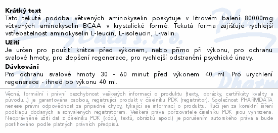 Tato tekutá podoba větvených aminokyselin poskytuje v litrovém balení 80000mg větvených aminokyselin BCAA v krystalické formě. Tekutá forma zajišťuje rychlejší vstřebatelnost aminokyselin L-leucin, L-isoleucin, L-valin.